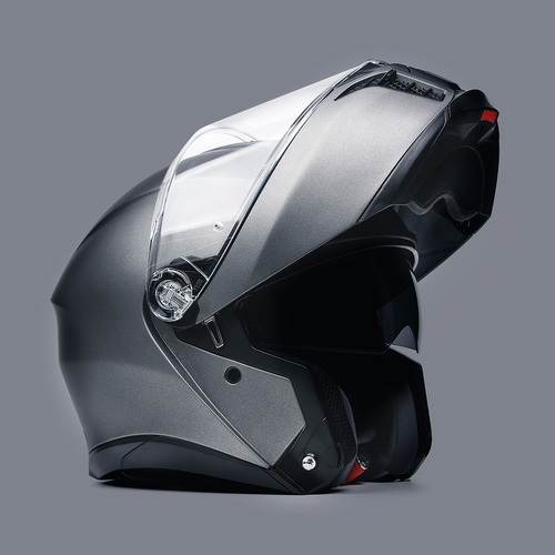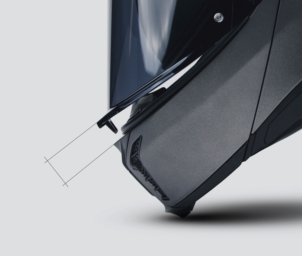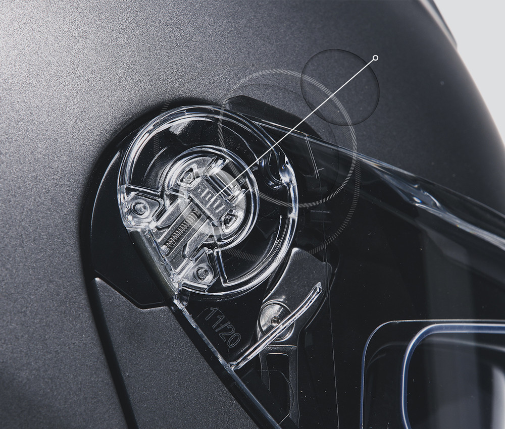 AGVは小型化した金属製のバイザーメカニズムを採用しています。これはAGVの特徴であり、シェルの構造を変えることなく、側面衝突による衝撃を最大限に保護することが可能になります。