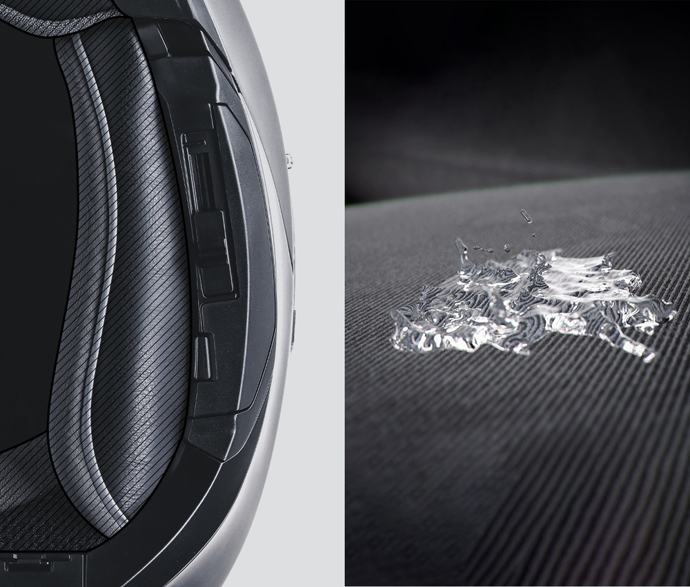 雨や大気中の物質を遮断して密閉状態を保ちます。襟元や内装の最も露出する部分には、撥水加工を施し、隙間からの水の侵入を防止します。ヘルメットのアウターシェルはそのままに、内側の高品質な素材が高い快適性を提供します。
