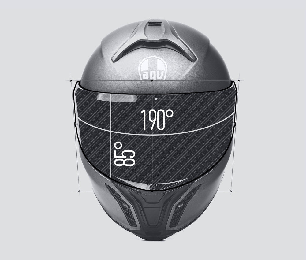 Tourmodularは、AGV Ultravisionの基準に沿って作成されています。その形状は、水平視野190°、垂直視野85°を可能にしており、目に自然に入ってくる情報を遮ることはありません。