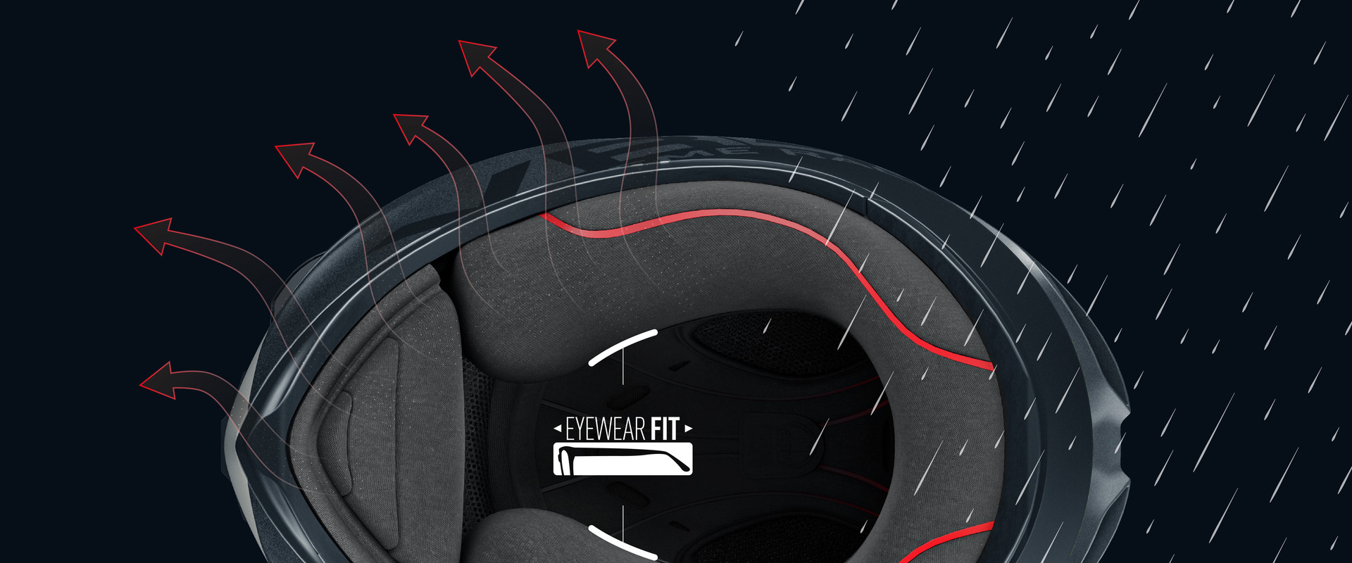 汗や湿気を瞬時に吸収し、ヘルメット内を快適に保ちます。眼鏡やサングラスを違和感なく着用できる内装仕様「EYEWAR FIT」を採用。