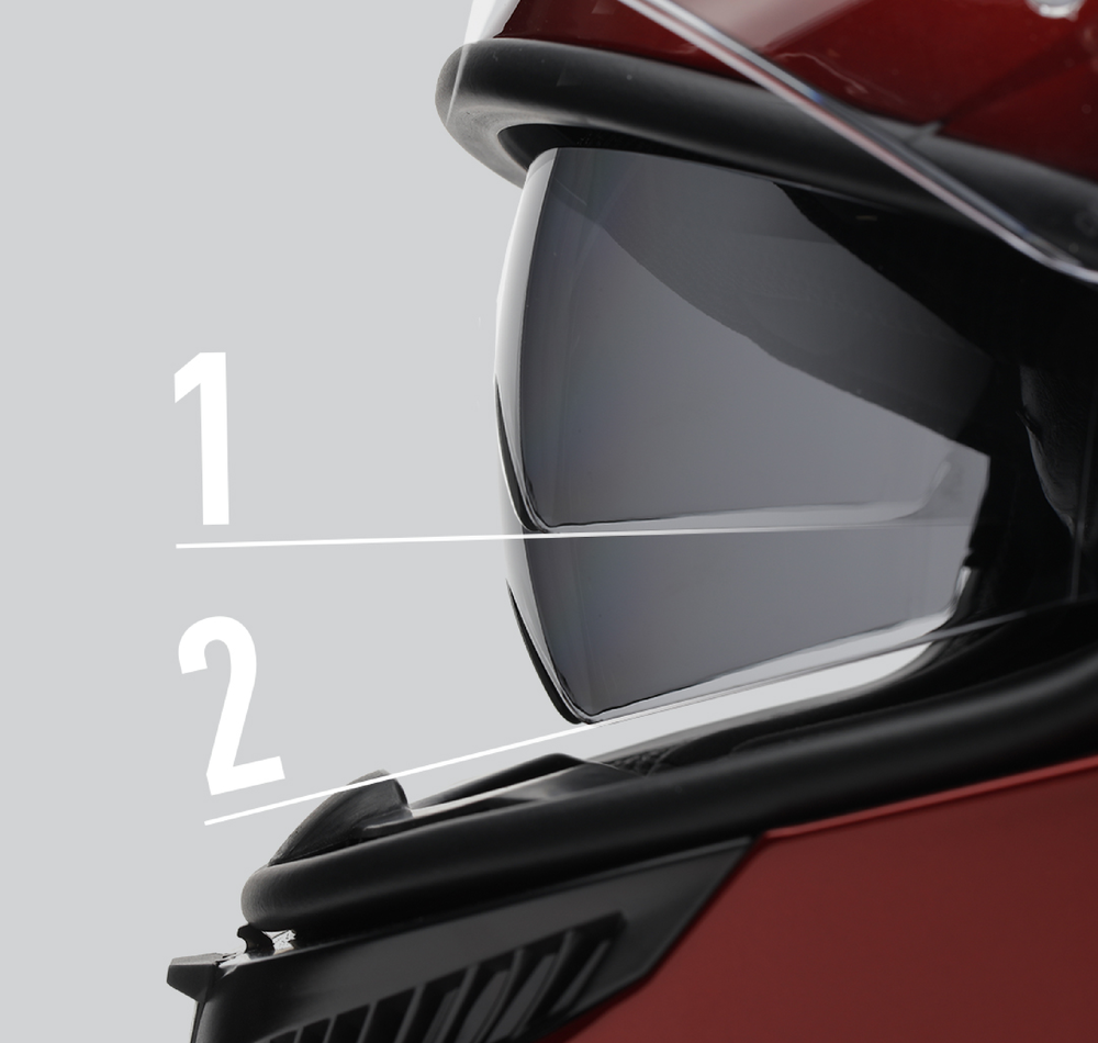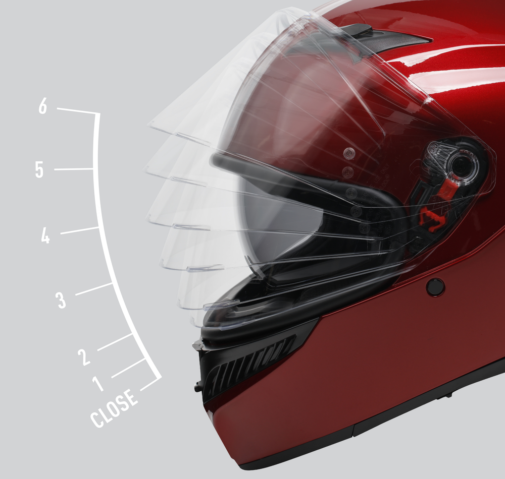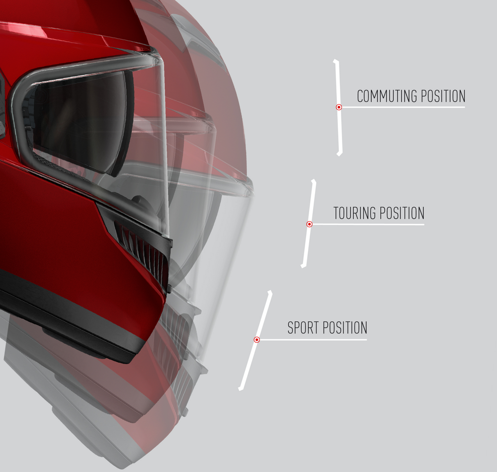 バイザーの位置は6段階の調整が可能で、状況に合わせてヘルメット内の空気の流れを調節することができます。さらに、新しい "City Position(シティポジション)"により、低速走行時にバイザーを開けた状態に保つことができ、シティライディングに最適です。