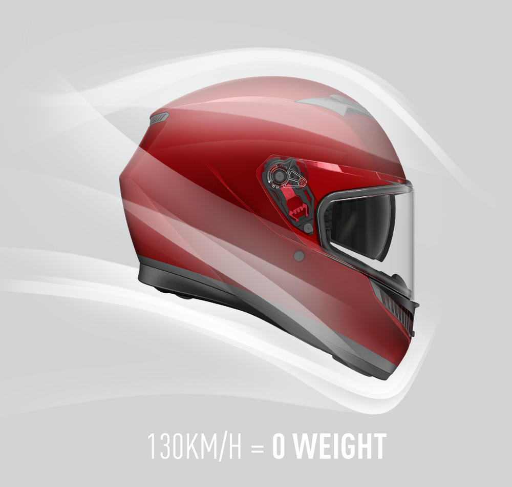K3は、130km/hの高速走行時に動的重量が0kgになるように設計されています。これにより、走行時の重量が抑えられるとともに、首への負担を軽減し、ライディングに集中することができます。