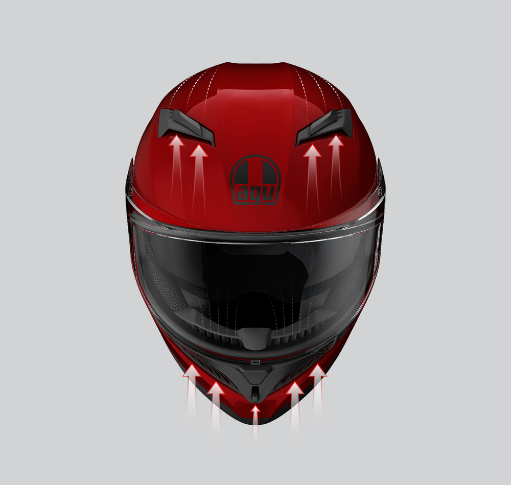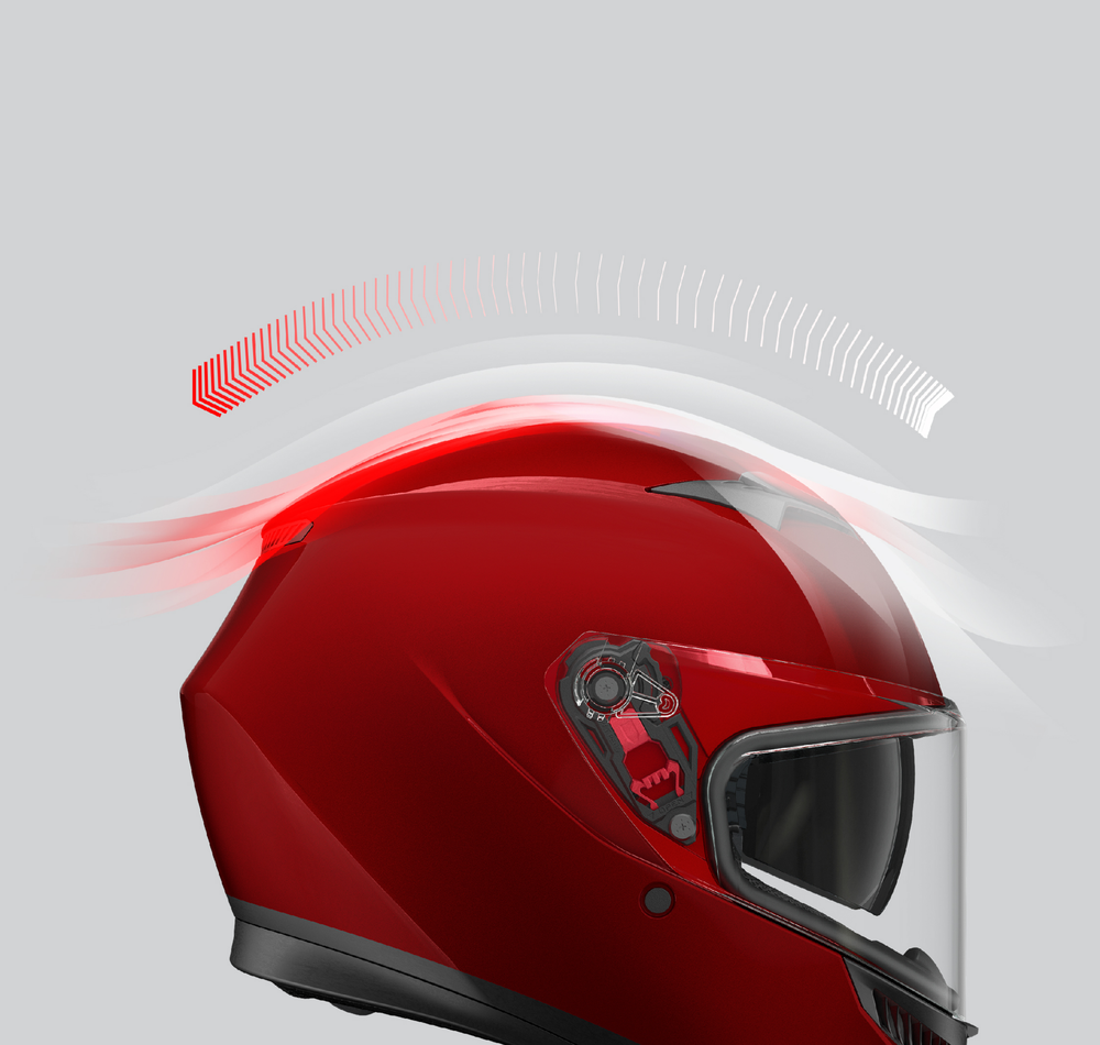 頭部には2か所のベンチレーションを備え、サンバイザーの収納時でも最適なエアフローを確保できるように設計されています。口元に備えられた2か所のベンチレーションは、様々なライディングスタイルに対応するように最適化されており、ヘルメット内に入る空気の速度を加速させるデザインになっています。Micro-Opening(マイクロオープニング): AGVシリーズの特徴であり、K3にも採用されています。バイザーを数ミリ開けて走行することが可能で、空気の流れを安全に調整しながら整え、後方のリアエクストラクターにより熱を外へ逃します。