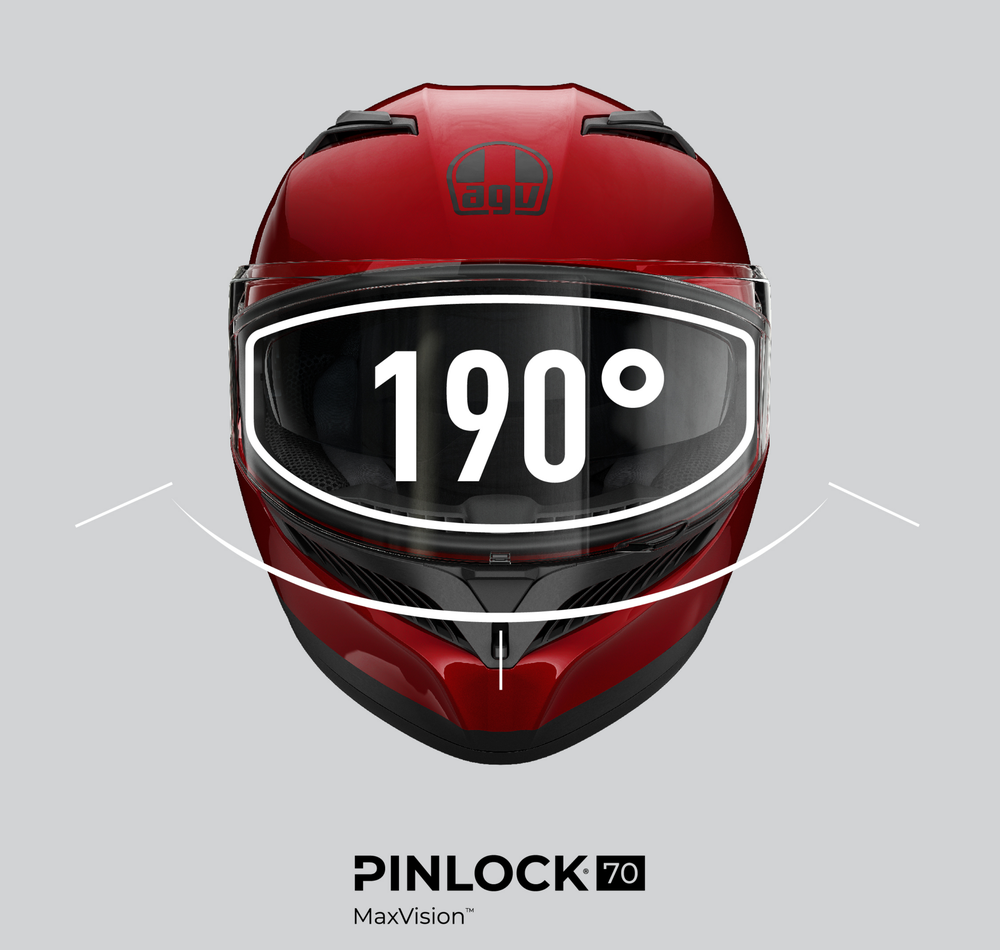 AGVが提供するUltravision(ウルトラビジョン)は、190°の水平視野を実現しており、路面やコーナー、障害物などを鮮明に、早く認識することができます。Pinlock Max Vision 70のアンチフォグシステムは、雨や寒い日の温度差によりバイザーが曇ることを防ぎ、常に最高の視界を保ちます。