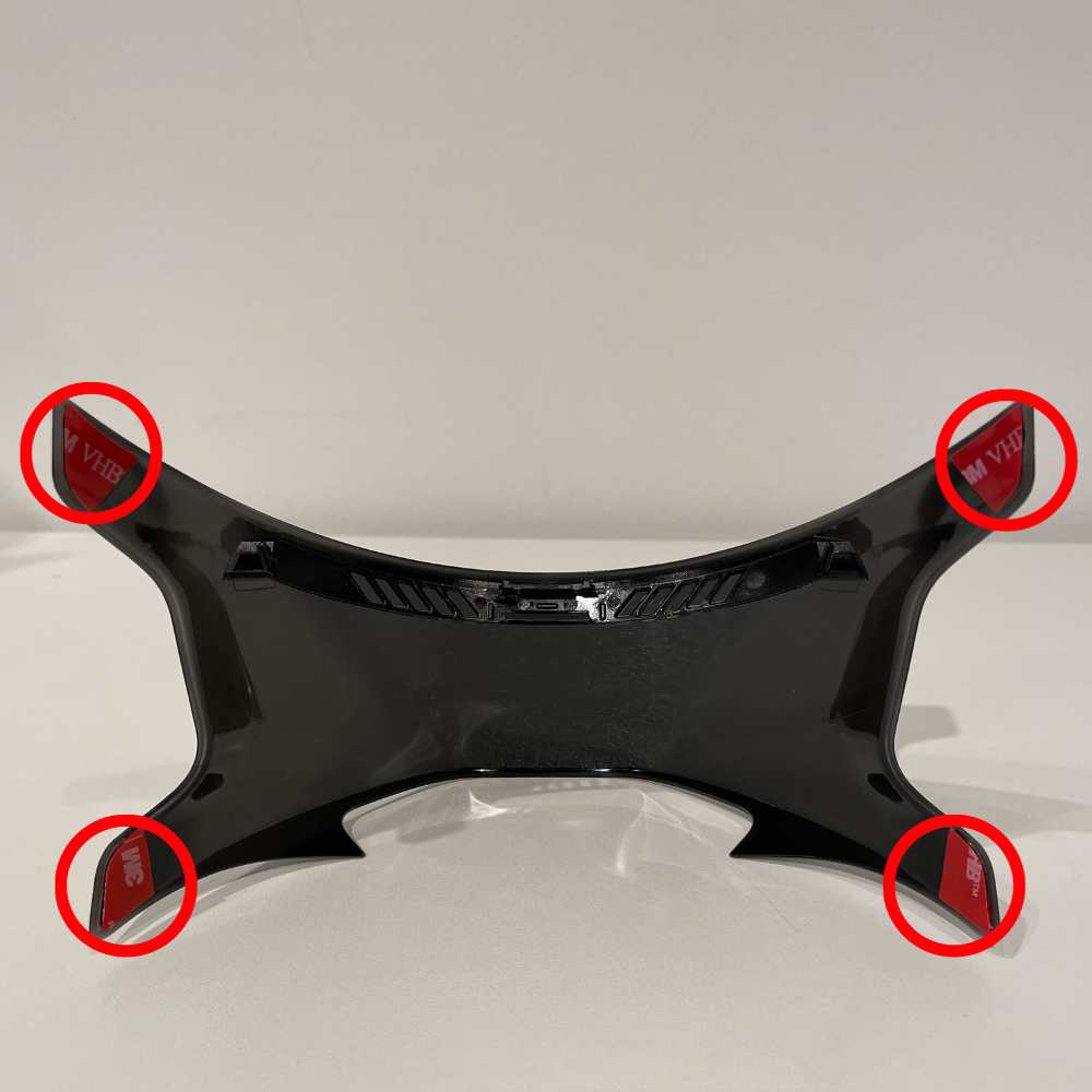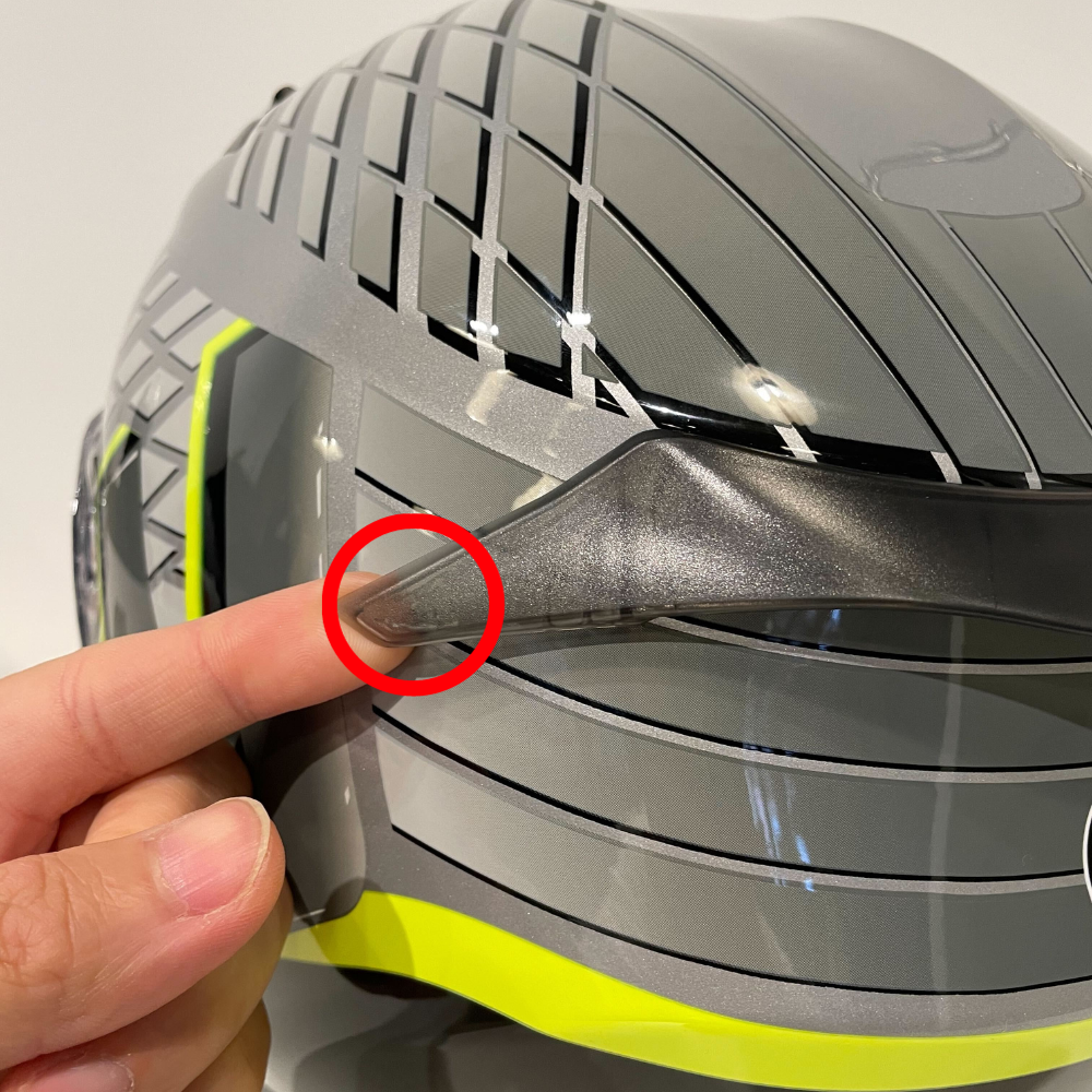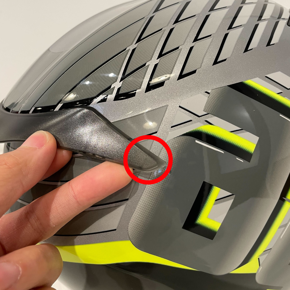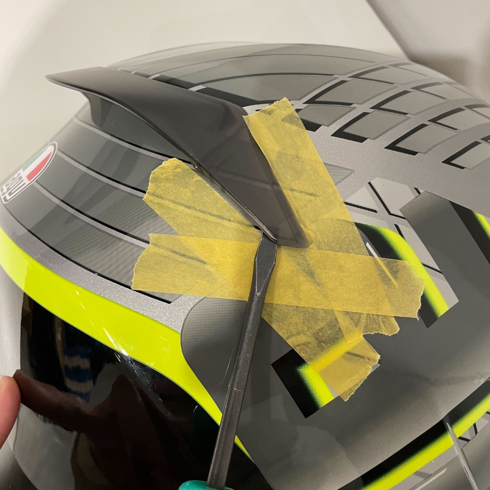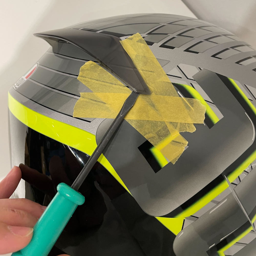 スポイラーに張り付けられた接着ゲルのシールを外します。 スポイラーとヘルメットとの位置を合わせて真ん中のツメ、左右のツメの順にはめ込みます。