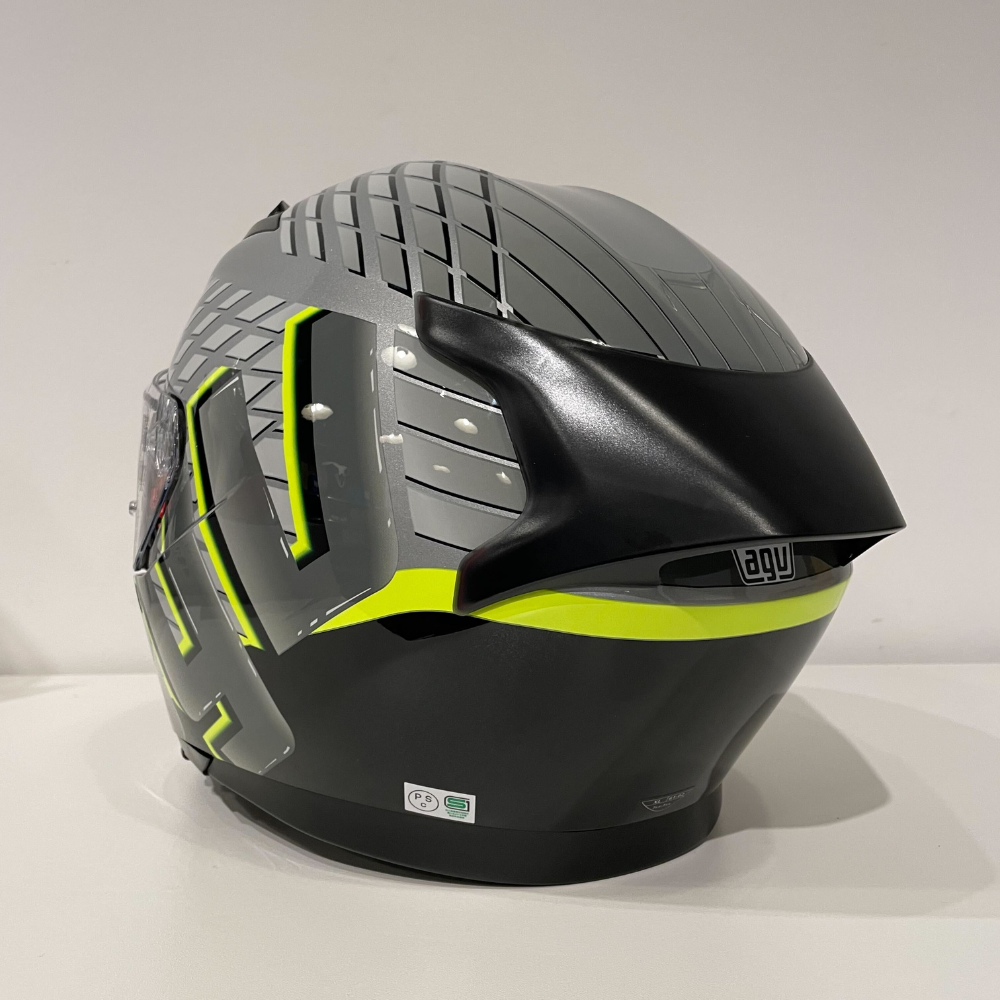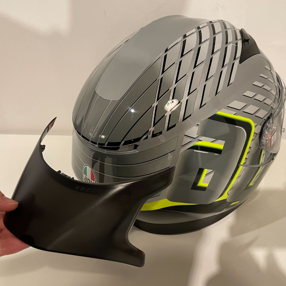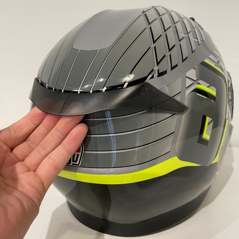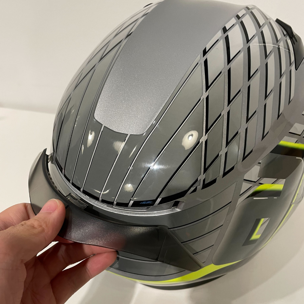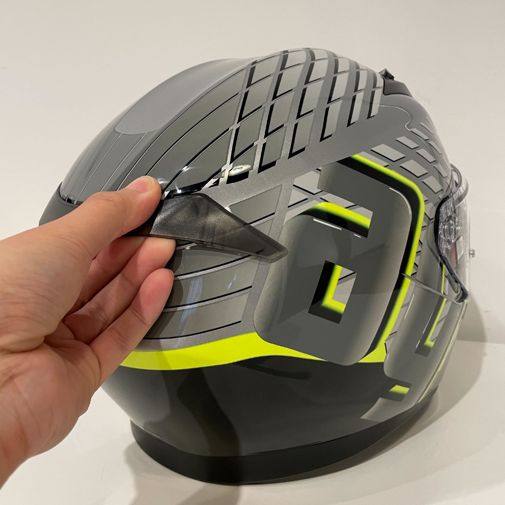 スポイラーに張り付けられた接着ゲルのシールを外します。 スポイラーとヘルメットとの位置を合わせて真ん中のツメ、左右のツメの順にはめ込みます。